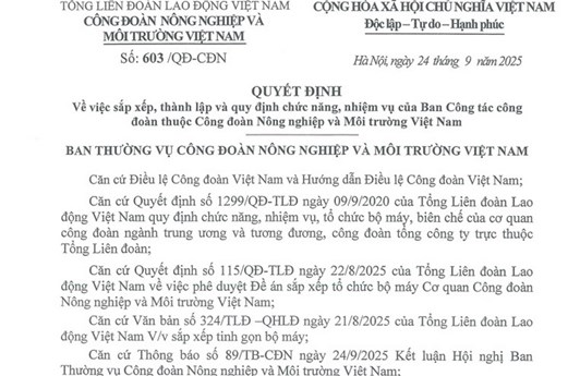 11/10/2025Công đoàn Nông nghiệp và Môi trường Việt Nam đã tiến hành sắp xếp tổ chức bộ máy và biên chế Cơ quan và chính thức triển khai mô hình tổ chức mới kể từ ngày 01/10/2025