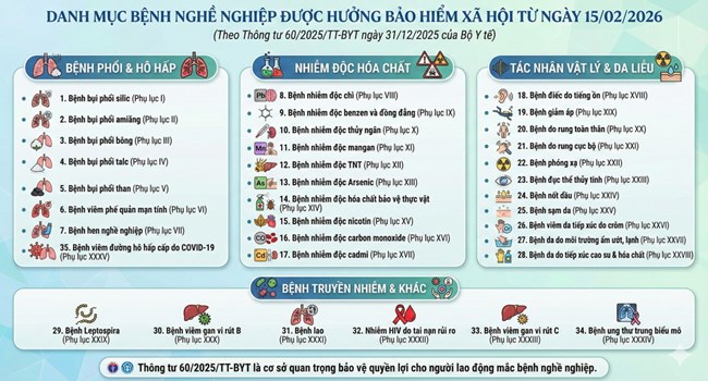 Ngày 31/12/2025, Bộ trưởng Bộ Y tế đã ký ban hành Thông tư 60/2025/TT-BYT quy định về bệnh nghề nghiệp được hưởng bảo hiểm xã hội và hướng dẫn chẩn đoán, giám định mức suy giảm khả năng lao động do bệnh nghề nghiệp. Thông tư có hiệu lực kể từ ngày 15 tháng 02 năm 2026.