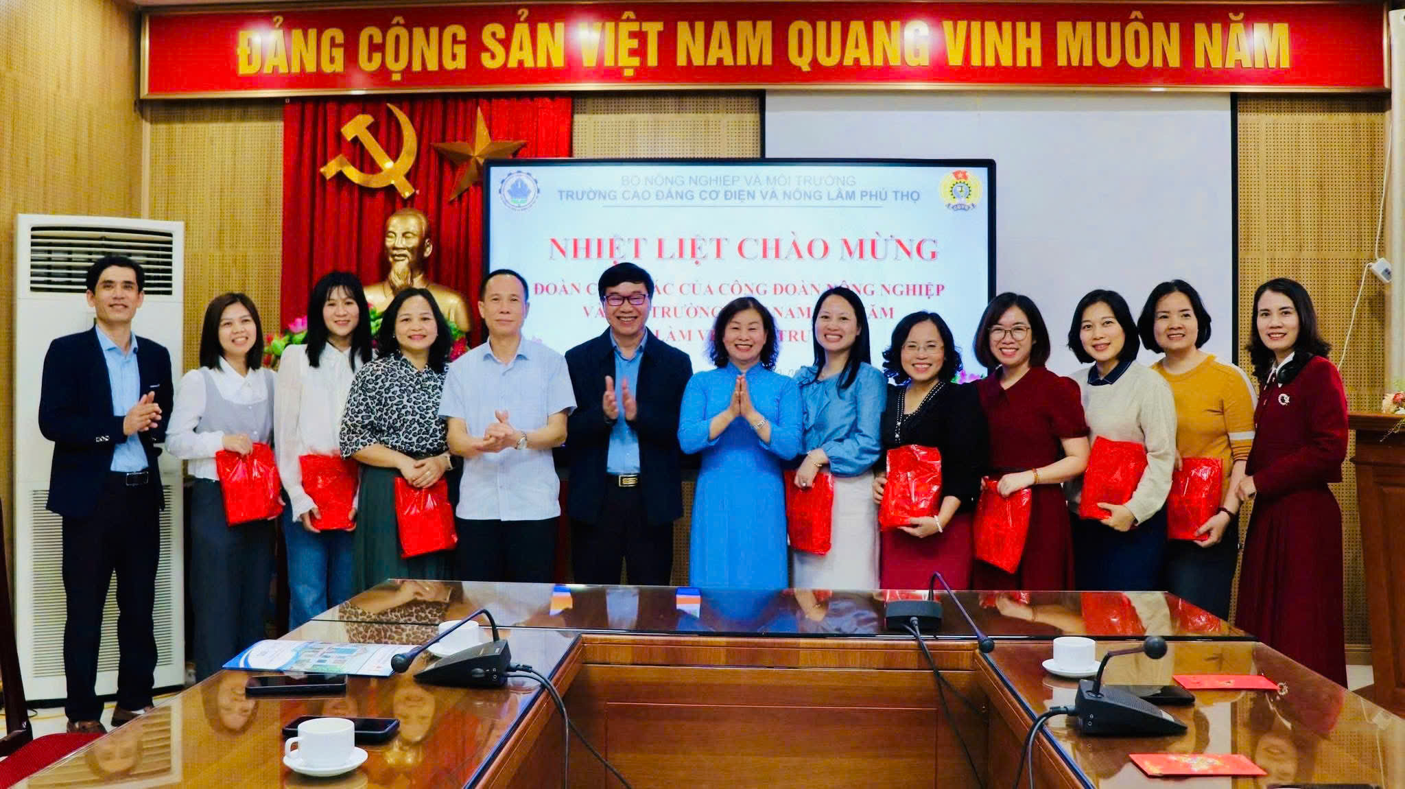 Nhân dịp này, Chủ tịch Công đoàn ngành Nông nghiệp và Môi trường Nguyễn Hà Xuyên đã tặng hoa chúc mừng Ngày Quốc tế Phụ nữ 8/3 cho đồng chí Bí thư Đảng uỷ Trường Cao đẳng Cơ điện và Nông lâm Phú Thọ. Đồng chí Trần Thị Thuý Lan - Hiệu trưởng Trường Cao đẳng Cơ điện và Nông lâm Phú Thọ cũng tặng hoa chúc mừng Ngày Quốc tế Phụ nữ 8/3 tới các đồng chí nữ trong đoàn công tác của Công đoàn ngành Nông nghiệp và Môi trường!