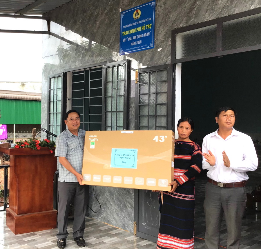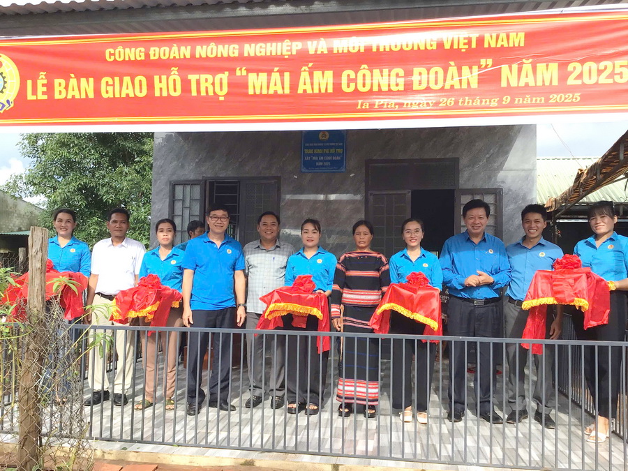 Ngày 26/9/2025, tại tỉnh Gia Lai, Công đoàn Nông nghiệp và Môi trường Việt Nam (Công đoàn Ngành) do đồng chí Nguyễn Hà Xuyên - Chủ tịch làm Trưởng đoàn đến thăm hỏi, động viên, trao tiền hỗ trợ xây dựng “Nhà mái ấm công đoàn” cho 03 gia đình đoàn viên công đoàn có hoàn cảnh khó khăn tại CĐCS Công ty Cà phê 706 và Công ty TNHH MTV Cà phê Ia Grai với tổng số tiền 150 triệu đồng. Trong đó, xây mới 02 căn, mức hỗ trợ 60 triệu đồng/căn; sửa chữa 01 căn, mức hỗ trợ 30 triệu đồng/căn.