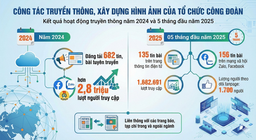 Nhiệm kỳ 2023–2025 chứng kiến bước tiến vượt bậc của công đoàn Ngành trong truyền thông và ứng dụng chuyển đổi số. Năm 2024, Công đoàn Ngành đăng tải 682 tin, bài trên website và mạng xã hội; 5 tháng đầu 2025 đạt hơn 1,68 triệu lượt tiếp cận nội dung.