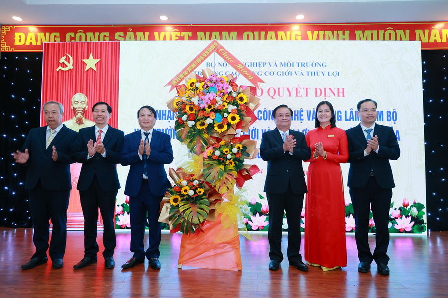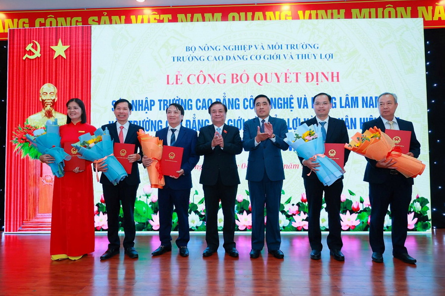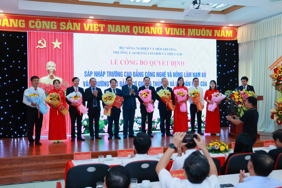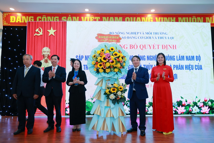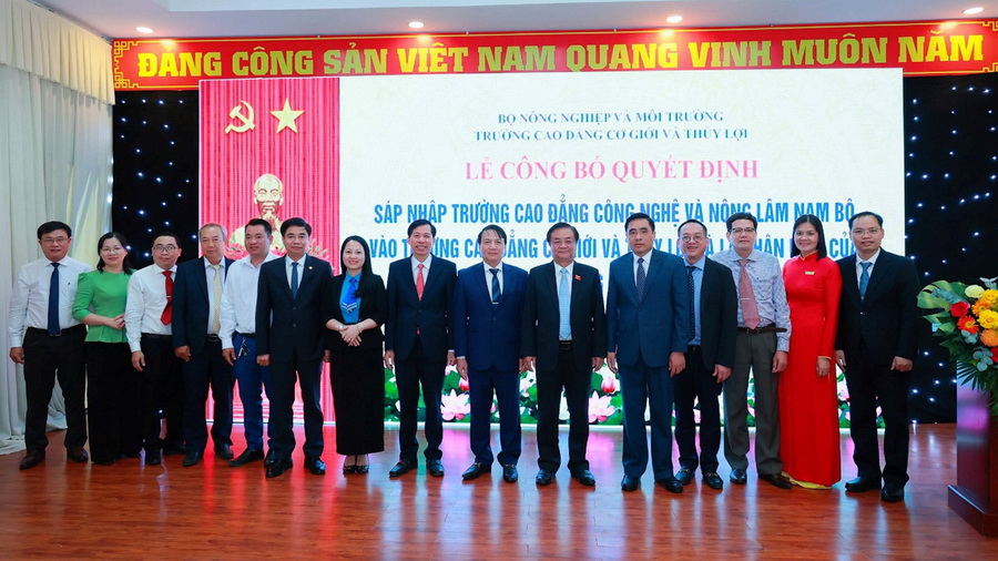 Tại buổi lễ, đồng chí Nguyễn Thành Lệ, Phó Vụ trưởng Vụ Tổ chức cán bộ, Bộ Nông nghiệp và Môi trường đã công bố Quyết định sáp nhập Trường Cao đẳng Công nghệ và Nông lâm Nam Bộ vào Trường Cao đẳng Cơ giới và Thủy lợi; đồng thời công bố các Quyết định quy định chức năng, nhiệm vụ, quyền hạn, cơ cấu tổ chức của Nhà trường và Phân hiệu tại TP. Hồ Chí Minh, cùng các Quyết định bổ nhiệm cán bộ lãnh đạo, quản lý.